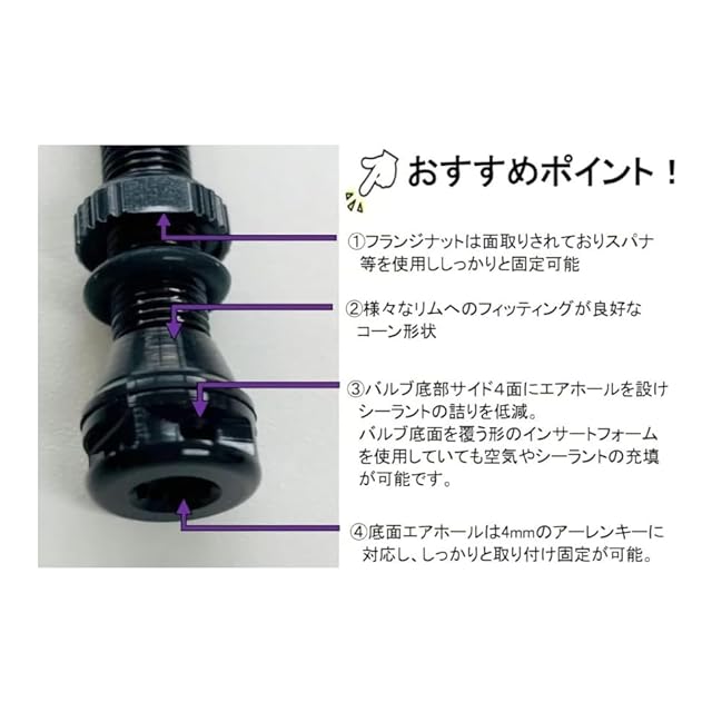 【簡単取り付け】バルブ根元には円錐形のパッキンを備え、多くのリムに対応。底面のエアホールとバルブナットに工具をかけることができるため、取り付けや固定も簡単。