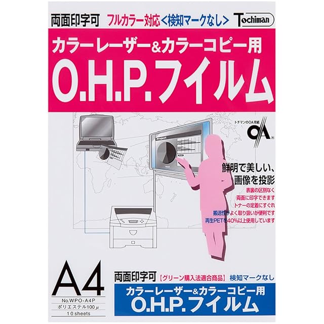 【その他】透明性の高いクリアーフイルムで、OHPで投影したとき鮮明な画像が映し出せます。特殊表面処理を施したフイルムです。P.P.C.複写機・レーザープリンタにおいて裏表なく両方の面に印字が出来て、熱による波打が小さく、トナーの融着にすぐれ、黒の色調が鮮明に得られます。修正が可能でO.H.P.ペンなどの筆記具で、加筆・着色ができます。検知なしのカラーレーザープリンタ・カラーコピー機で使用できます。