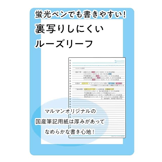【付属】ルーズリーフ(メモリ入7mm罫10枚、ワイド5mm方眼罫1枚)、クリアポケット1枚、ラミネートタブインデックス10山1組、挿入紙(商品説明紙)1枚、キャッチシール1枚(背表紙に貼付)