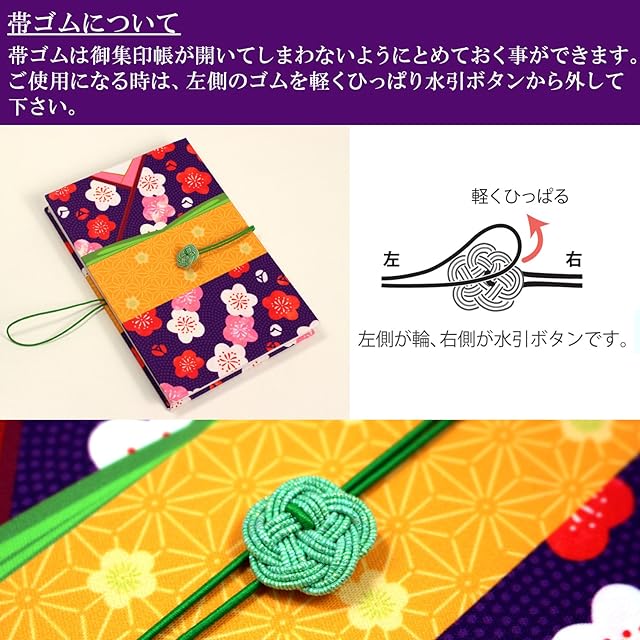 帯留めに見立てた水引ボタンと帯ゴムは取り外しができ、御集印帳が開いてしまわないように留めておく事ができます。