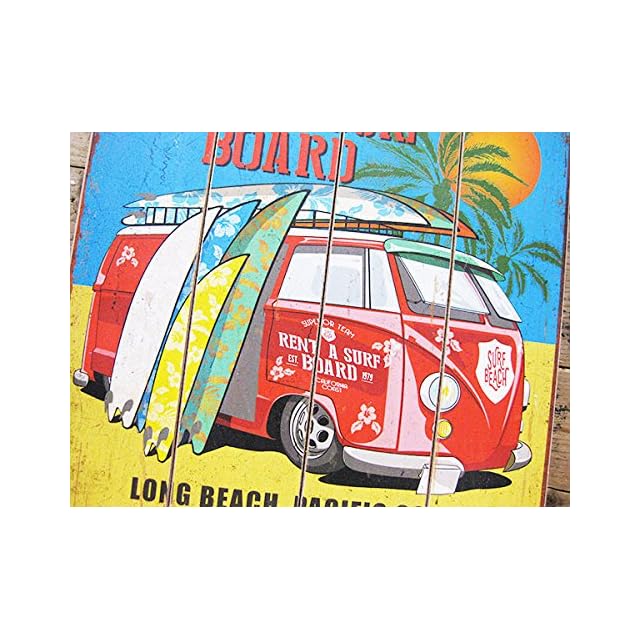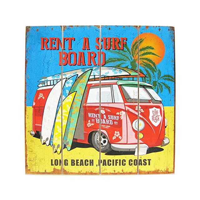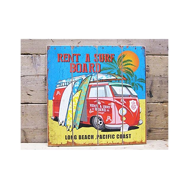 アメリカンなウッドサインボードになります。<BR> <BR> ロングビーチでサーフボードをレンタルするバスのデザイン。<BR> <BR> 4枚並べた木板にデザインシートを貼りつけ、まるで木板に描かれたような雰囲気♪<BR> <BR> 経年劣化したようなダメージデザインになっているのでアンティーク風で非常にオシャレ♪<BR> <BR> 背面の取り付け穴を利用してビスやフックで壁に飾ることができます。<BR> <BR>ウッドボードなので立て掛けて飾るのもオシャレでしょう<BR> <BR> 部屋やガレージ、玄関など手軽に雰囲気UPが期待できるウッドボードですよ♪<BR> <BR> <BR> サイズ(約)<BR> H40cm X W40cm X D2cm<BR> <BR> 素材<BR> 木(MDF)製