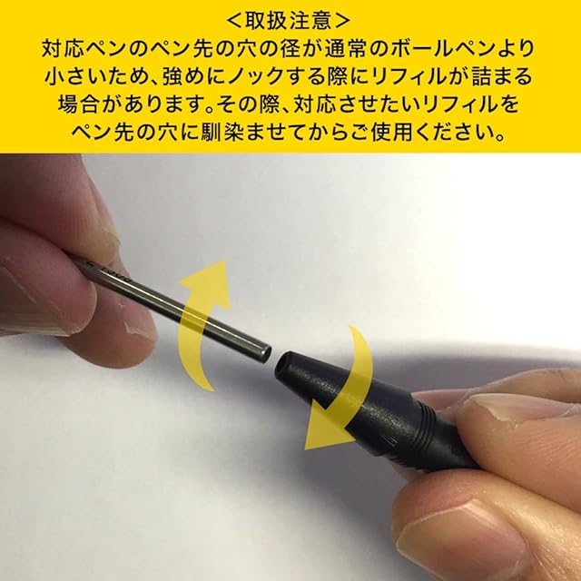 取扱注意:対応ペンのペン先の穴の径が他のペンより小さいため強めにノックする際にリフィルが詰まる場合があります。ノックが強めの方は対応させたいリフィルをペン先に馴染ませてからご使用ください。
