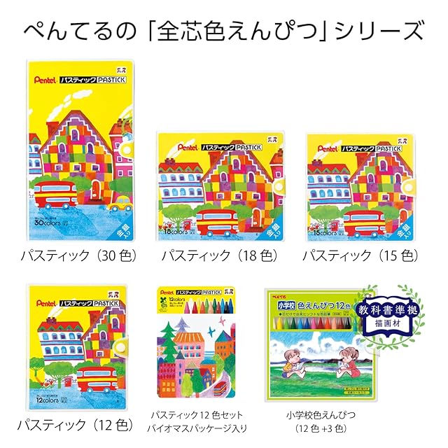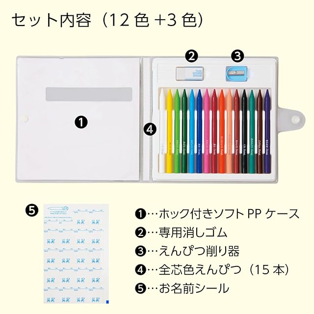 【特長】基本の12色に小学校6年間の授業で使いやすい3色をサービスした、芯だけでできたソフトな色鉛筆。