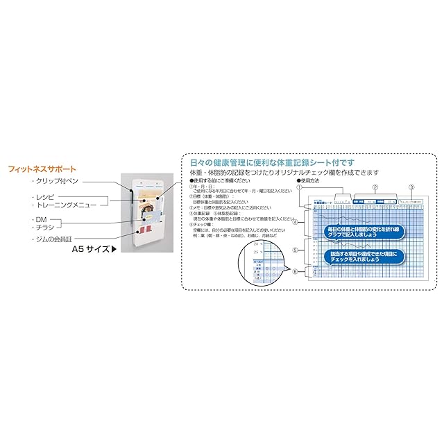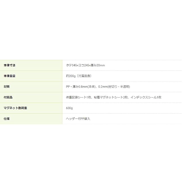 付属品:体重記録シート1枚、粘着マグネットシート2枚、インデックスシール1枚