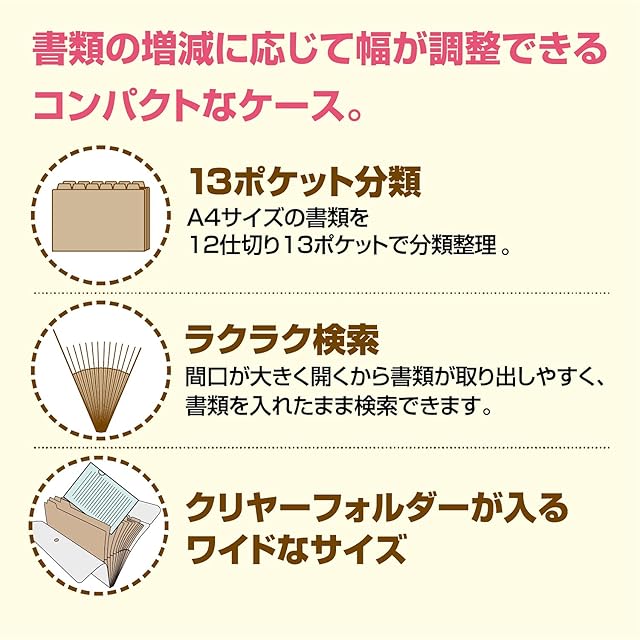 12仕切り13ポケットのドキュメントファイル。薄型なので持ち運びも簡単。
