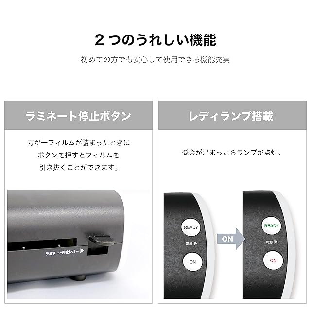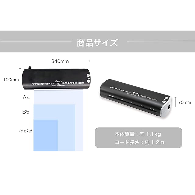 ウォームアップ時間:5~8分。最大ラミネート厚:0.4mm