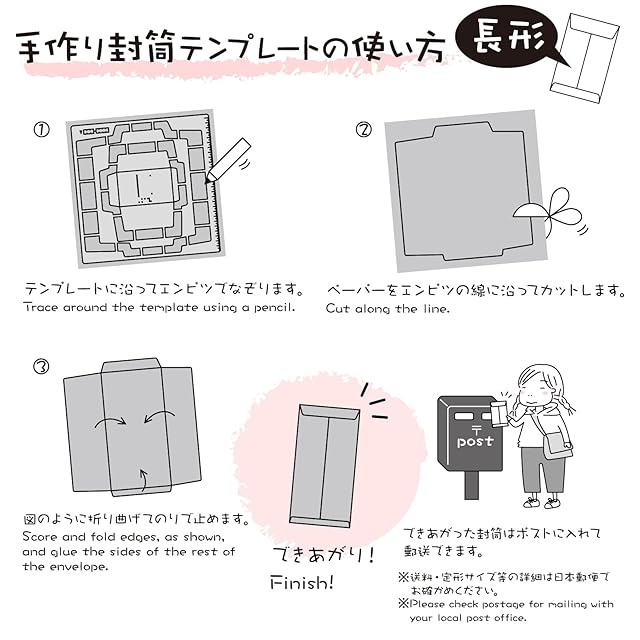 テンプレートを使って自分だけの封筒が作れる。1枚のテンプレートで長形封筒が4つのサイズが作れる。