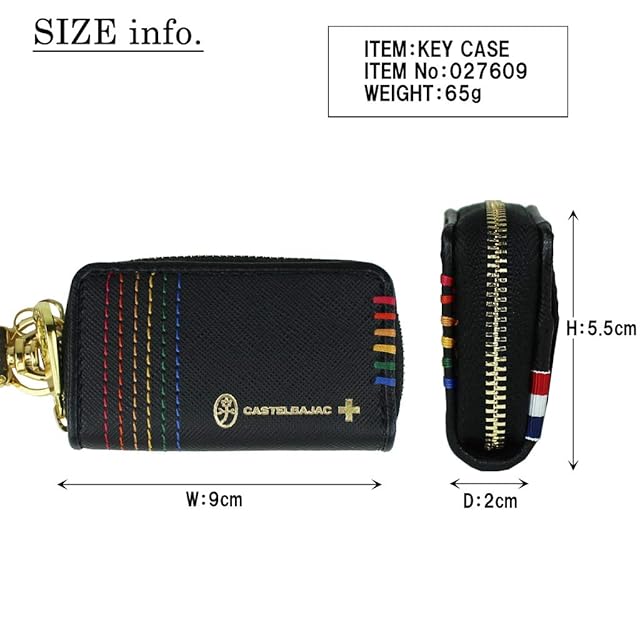 カステルバジャック(バッグ&ウォレット)(CASTELBAJAC)のスマートキー対応 キーケース。[ポイント]カステルバジャックで使用される6色のイメージカラーを飾りステッチと手かがりステッチで表現。ネーム表現や金具、裏生地のサテン生地にゴールド色を使用しユニセックスな感覚に仕上がっています。[素材]本体素材にはサフィアーノ調エンボスを施した牛革を使用しています。アイロン加工により凹凸部分でナチュラルなツヤを出し、質感を高めています。[機能・収納]● ナスカン金具部にキーリング小×2● ポケット× 2● 背面コインポケット[型番:27609]